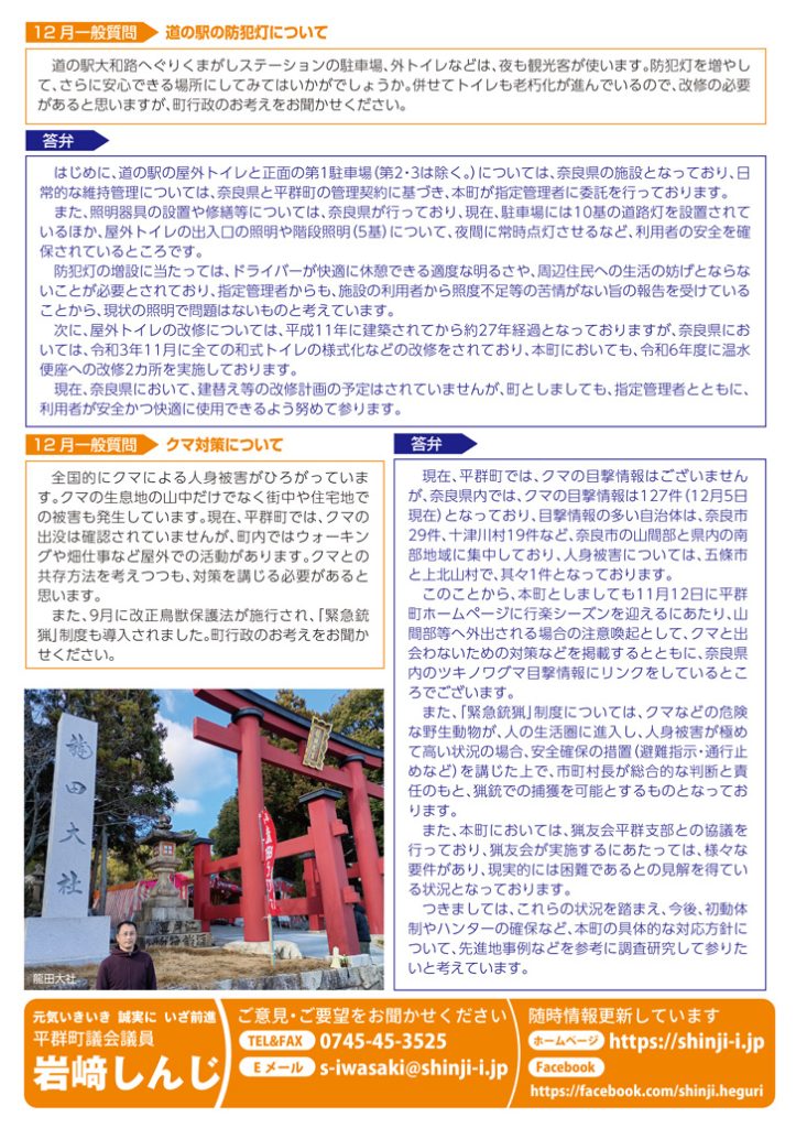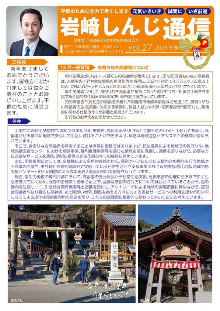 岩﨑しんじ通信Vol.27(冬号)を発行しました 2026/01/30 この記事を書いている人 - WRITER - shinji-iwasaki 岩﨑しんじ通信Vol.27(冬号)を発行しました。これからも平群町のために頑張ります。よろしくお願いいたします。 この記事を書いている人 - WRITER - shinji-iwasaki 関連記事 - Related Posts - へぐり時代祭り 岩﨑しんじ通信Vol.02(秋号)を発行しました ホームページオープン 岩﨑しんじ通信Vol.03(冬号)を発行しました 最新記事 - New Posts - 岩﨑しんじ通信Vol.27(冬号)を発行しました 岩﨑しんじ通信Vol.25(夏号)を発行しました 第3回へぐり花火大会 岩﨑しんじ通信Vol.24(春号)を発行しました